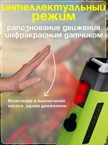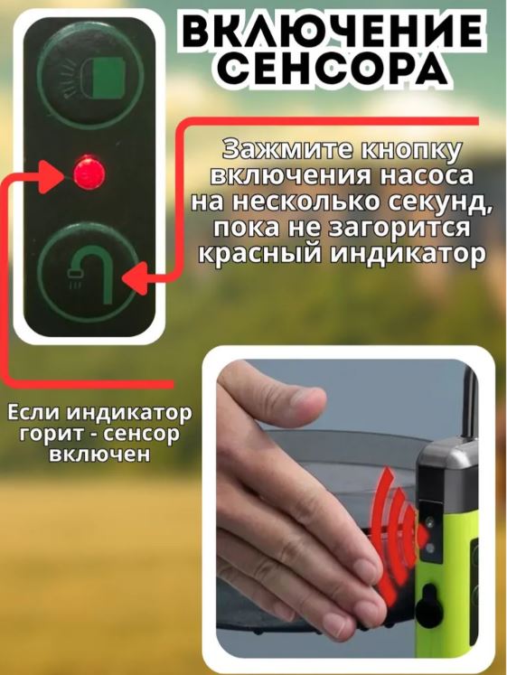 Нажмите и удерживайте кнопку включения насоса в течении 3 секунд. Как загорится индикатор (красная лампа) режим включен. В боковой части насоса имеются 2 датчика, для включения/ выключения насоса достаточно просто провести рукой или любым предметом возле датчиков. Для отключения нажмите и удерживайте кнопку включения насоса в течении 3 секунд.